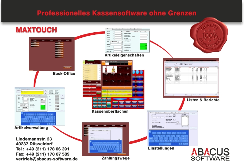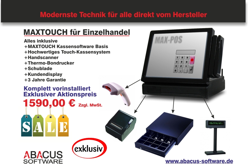 Aktion Kassensystem für Einzelhandel. Am Kassenarbeitsplatz trifft der Kunde auf Ihr Unternehmen, daher ist der Kassenbereich ein wichtiger Bestandteil Ihres Betriebes. Vielfach werden Spontankäufe getätigt oder gezielt beraten. Die Maxtouch Kassensysteme sind für den Dauerbetrieb ausgelegt. Die Kassensoftware ist ONLine oder OFF Line einsetzbar, d.h. die Kasse ist auch dann einsatzbereit, wenn das Netzwerk nicht verfügbar ist. Geeignet als Einplatzkasse, Netzkasse oder als Filialkasse für 1...1000 Filialen. Das Kassenlayout und die Funktionen sind einstellbar, so dass Sie den bestmöglichsten, d.h. einfachsten Kassenablauf erhalten. Maxtouch Kassensysteme sind geeignet für Touchkassen mit Scanning, Laptop, iPAD oder als Handykasse. Rufen Sie uns an, wir beraten Sie gerne. Kostenfreie und unverbindliche Beratung Bestpreis