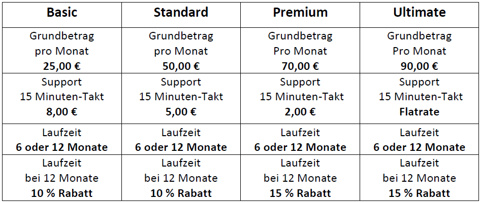 Wir haben für Sie vier unterschiedliche Service-Pakete zur individuellen Auswahl zusammengestellt. Die Vorteile dieser Leistungspakete auf einen Blick: telefonischer Support Software-Updates Behebung von Soft- und Hardware-Problemen Fernwartung über das Internet