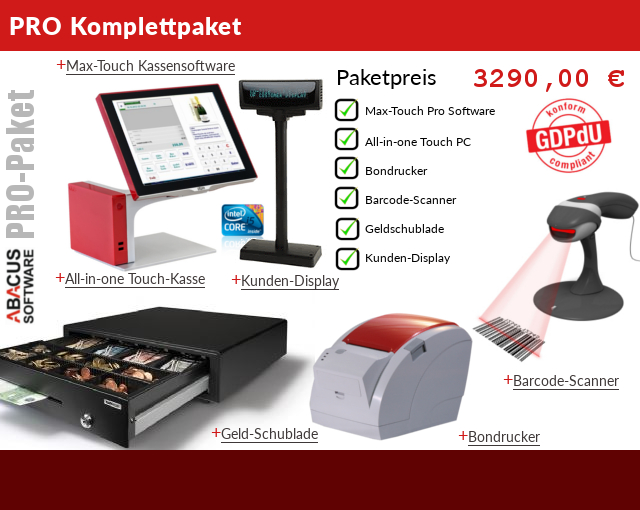 Kassensysteme, Kassensoftware, Kassensystem, Kasse, Kassen, Kassen Software, Pronto, Ticket, Ticket Software, Kassensysteme Gastronomie, Kassensysteme Einzelhandel, Handel, Einzelhandel, Filialisierung, Filialmanagment-Systeme, Hotelsoftware, Kassensysteme Hotel, Kassensyste-App Android, Scanner, Skin, Tischplan, Party service, Service-Wartungsvertrag Abacus- Online Shop Kontakt bitte mit uns Abacus Software Lindemannstr. 23 D-40237 Düsseldorf Tel : +49 (211) 178 06 391 Fax: +49 (211) 178 07 589 https://www.abacus-software.de/kassensoftware-kassensysteme/kassensytem-komplettpaket-fur-einzelhandel-3/