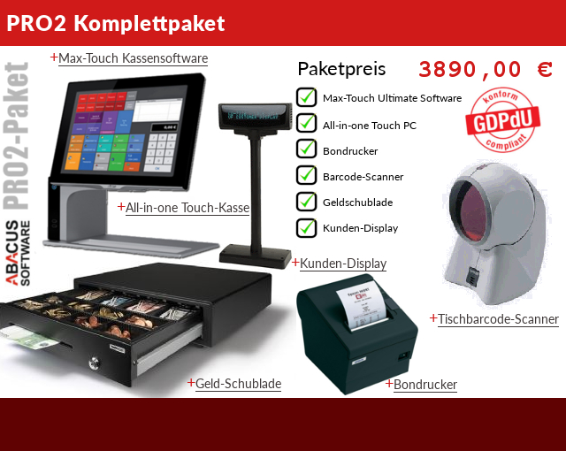 Kassensysteme, Kassensoftware, Kassensystem, Kasse, Kassen, Kassen Software, Pronto, Ticket, Ticket Software, Kassensysteme Gastronomie, Kassensysteme Einzelhandel, Handel, Einzelhandel, Filialisierung, Filialmanagment-Systeme, Hotelsoftware, Kassensysteme Hotel, Kassensyste-App Android, Scanner, Skin, Tischplan, Party service, Service-Wartungsvertrag Abacus- Online Shop Kontakt bitte mit uns Abacus Software Lindemannstr. 23 D-40237 Düsseldorf Tel : +49 (211) 178 06 391 Fax: +49 (211) 178 07 589 https://www.abacus-software.de/kassensoftware-kassensysteme/kassensytem-komplettpaket-fur-einzelhandel-3/